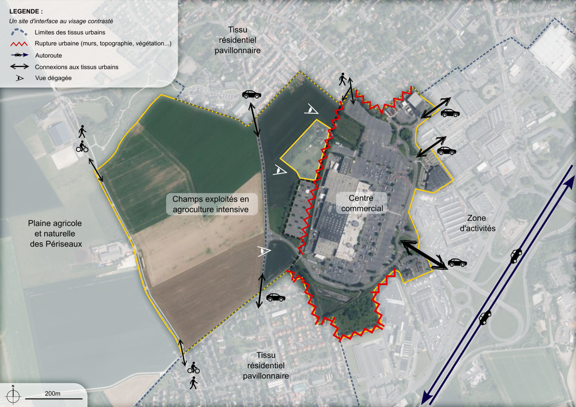 - sur le site commercial de 14 ha, réduction de la surface commerciale existante, réduction et concentration des stationnements, renaturation des espaces extérieurs, libération de foncier en vue d’accueillir de nouveaux programmes : logements, services, bureaux, … à définir ultérieurement, ouverture du site sur la plaine agricoles des Périseaux.